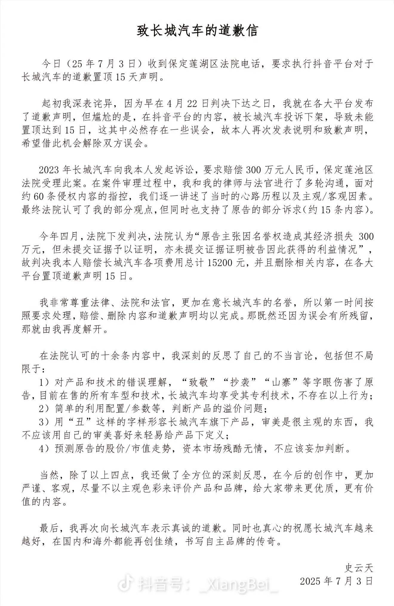 该博主称,因为早在 4 月 22 日判决下达之日,他就在各大平台发布了道歉声明,但尴尬的是,在抖音平台的内容,被长城汽车投诉下架,导致未能置顶达到 15 日,这其中必然存在一些误会,故本人再次发表说明和致歉声明,希望借此机会解除双方误会。