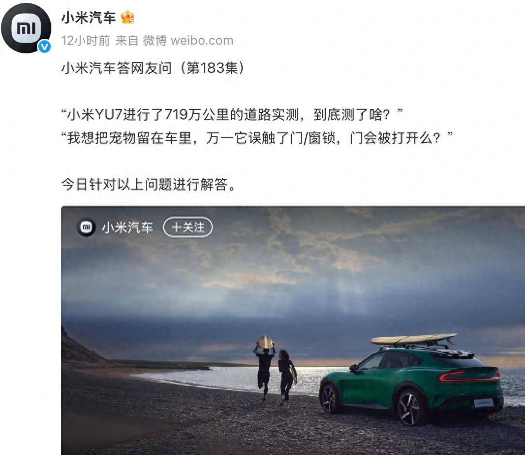 【环球网科技综合报道】7月25日消息,小米汽车今日发布《答网友问》第 183 集,集中披露小米 YU7 SUV 道路实测、宠物模式、雨天行车及家用充电方案的最新进展。