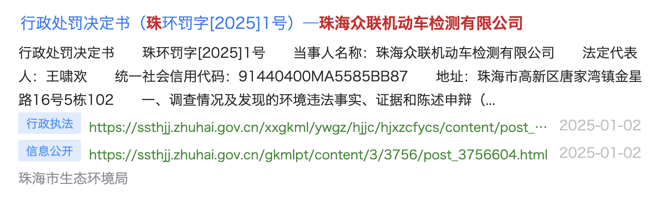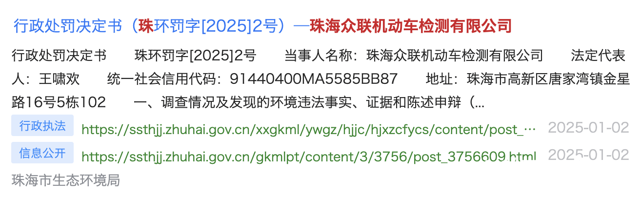 行政处罚决定书(珠环罚字[2025]1号)显示,珠海市生态环境局于2024年10月15日至11月27日期间对珠海众联机动车检测有限公司进行调查,发现该单位从事机动车安全及尾气排放的检验检测过程中,实施了包括“轻型柴油检测线未配备NO₂标准气体;轻型柴油检测线设备检测软件无NO₂检查功能;双怠速检测转速控制插管不规范;桂A·L279G双排气管小轿车检测时只采集一支排气管口”等在内的生态环境违法行为,并依据相关规定,对珠海众联机动车检测有限公司罚款人民币12500元。