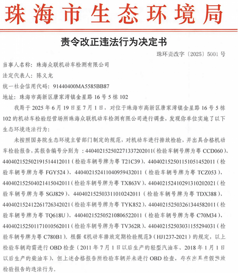 7月18日,珠海市生态环境局发布“责令改正违法行为决定书(珠环责改字〔2025〕5001号)”,指出该局于今年6月19日至7月1日,对珠海众联机动车检测有限公司进行调查,发现该企业未按照国务院生态环境主管部门制定的规范,对机动车进行排放检验,并出具合格机动车检验报告。