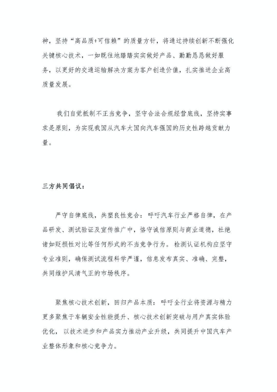 三方共同倡议汽车行业严格自律,在产品研发、测试验证及宣传推广中,恪守诚信原则与商业道德,杜绝诸如贬损性对比等任何形式的不当竞争行为。检测认证机构应坚守专业准则,确保测试流程科学严谨,信息发布真实、准确、完整,共同维护风清气正的市场秩序。