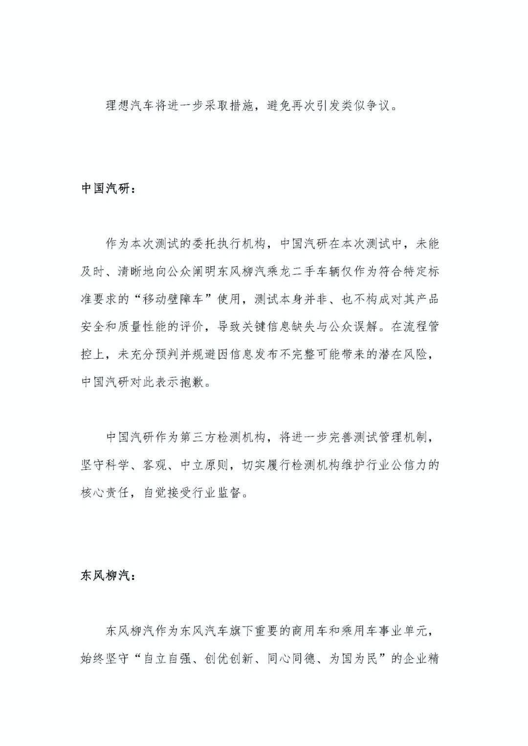 理想汽车表示,本次测试目的是验证和提升理想i8的被动安全性能,并不针对任何其他品牌车辆的安全和质量性能。理想汽车将进一步采取措施,避免再次引发类似争议。同时,理想汽车还提到,对于测试过程导致东风柳汽乘龙品牌被意外卷入舆情争议,对相关内容的传播可能引发的品牌关联风险预估不足,导致东风柳汽乘龙品牌无端陷入负面舆情,对其品牌形象造成损害,带来不良影响,同时也让长期支持和使用东风柳汽产品的卡友及相关公众造成了误解,理想汽车在此表示诚挚的歉意。