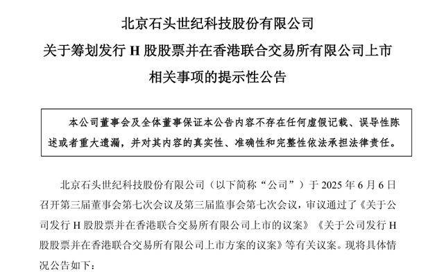 6月6日,石头科技公告称,为满足公司业务发展的需要,进一步提升公司的全球品牌知名度及竞争力,巩固行业地位,同时更好地利用国际资本市场优势,优化资本结构和股东组成,拓展多元化融资渠道,提升公司治理水平和核心竞争力,公司拟于境外发行股份(H股)并在香港联合交易所有限公司(以下简称“香港联交所”)主板上市。