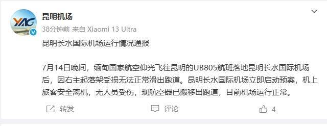 新商业市场:昆明机场通报一航班起落架受损:启动预案,机上旅客安全离机 中新网7月15日电 据“昆明机场”微博消息,昆明机场15日发布情况通报称,7月14日晚间,缅甸国家航空仰光飞往昆明的UB805航班落地昆明长水国际机场后,因右主起落架受损无法正常滑出跑道。昆明长水国际机场立即启动预案,机上旅客安全离机,无人员受伤,现航空器已搬移出跑道,目前机场运行正常。