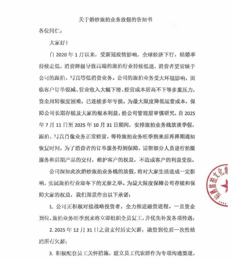 网上流传的告知书称:“自2020年1月以来,受新冠疫情影响,全球经济下行,结婚率持续走低”,“高端的旅拍行业持续低迷,消费者更青睐于公司的跟拍、写真等低消费业务。公司旅拍业务受大环境影响,面临客户订单锐减、营业收入大幅下滑、经营成本居高不下等多重压力,资金周转极度困难,已连续多年亏损,为最大限度降低运营成本,自2025年7月11日至2025年10月31日期间,安排旅拍业务线放淡季假,跟拍、写真肖像业务正常经营,等待旅拍业务旺季到来后再择期通知恢复时间。”
