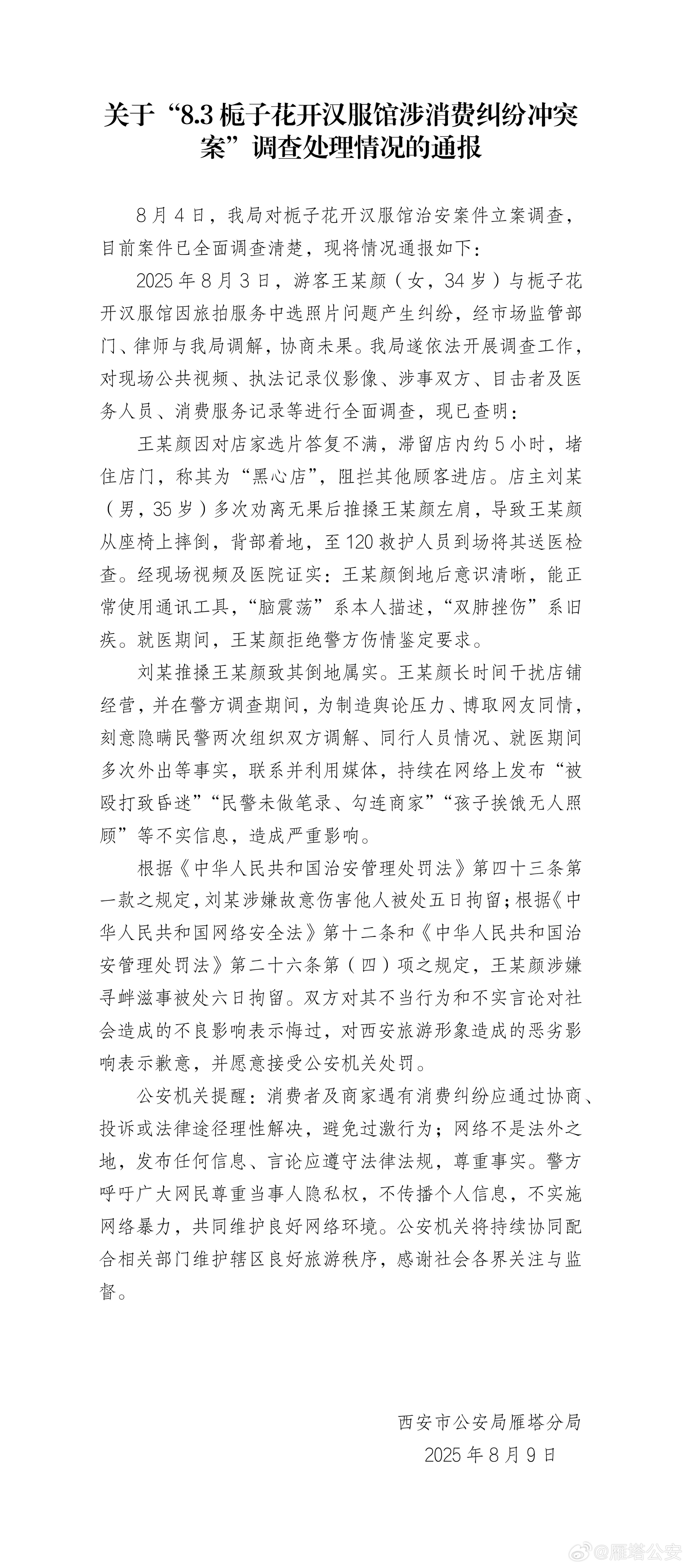 据雁塔公安微博消息,西安雁塔公安8月9日通报“8.3栀子花开汉服馆涉消费纠纷冲突案”调查处理情况。