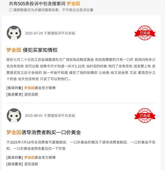综合黑猫投诉平台、消费保及全国12315消费投诉信息公示平台的投诉情况来看,梦金园主要因售卖假货、隐瞒克重、产品质量瑕疵、诱导购买、侵犯买家知情权等一系列问题,遭到消费者投诉。