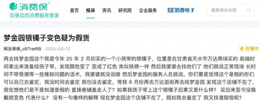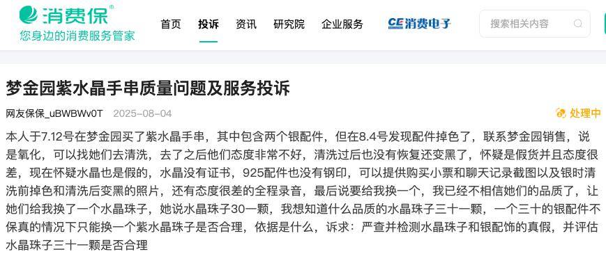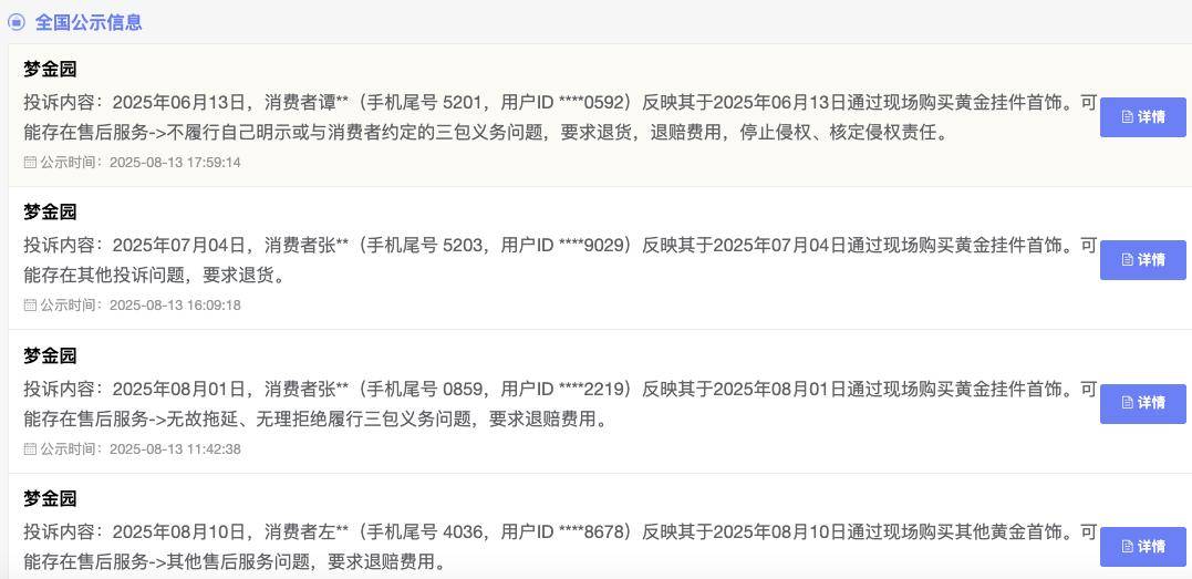 值得关注的是,2024年梦金园因“金包银事件”受到广泛关注。进入2025年, 关于其黄金产品质量与服务方面的投诉频繁出现。