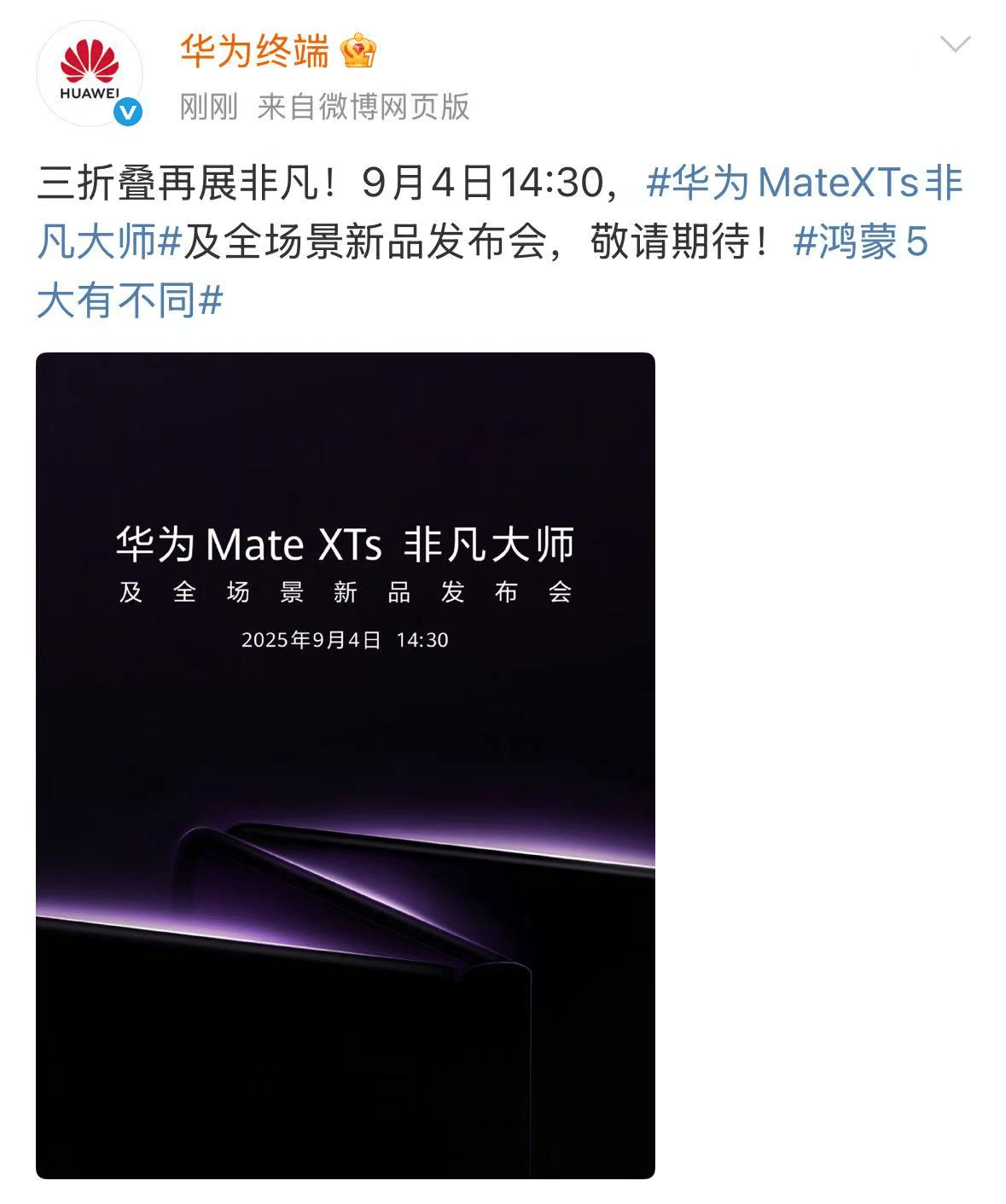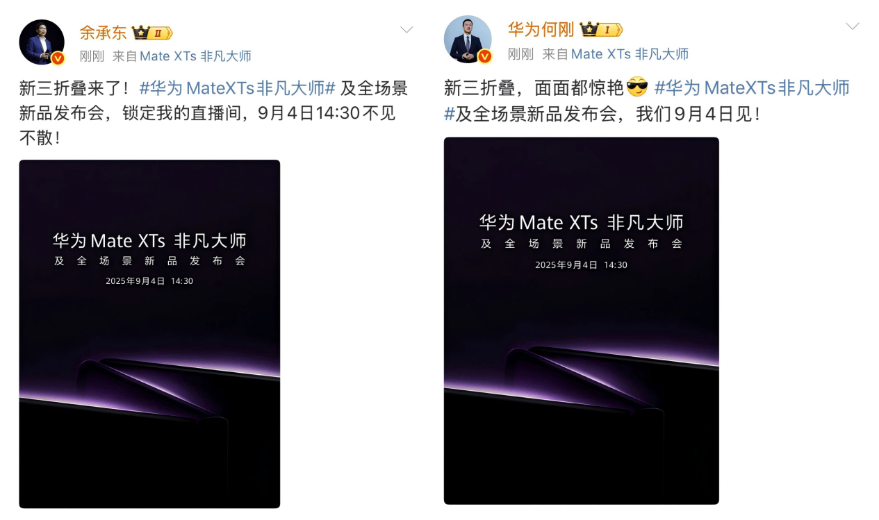 8月27日,华为终端官方微博释出一则海报,迅速引发广泛关注和讨论。该海报不仅揭示华为Mate XTs 非凡大师及全场景新品发布会将于9月4日14:00举行,更以简洁而意味深长的设计元素,为外界留下颇多悬念。值得注意是,华为常务董事、终端BG董事长余承东,以及华为终端BG首席执行官何刚也第一时间转发微博,这也展现了华为高层对此次新品的重视程度。