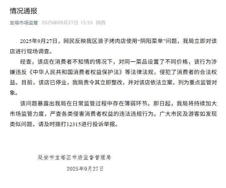 央视网消息:据“宝塔市场监管”微信公众号消息,2025年9月27日,网民反映陕西延安市宝塔区浪子烤肉店使用“阴阳菜单”问题,陕西延安市宝塔区市场监督管理局立即对该店进行现场调查。