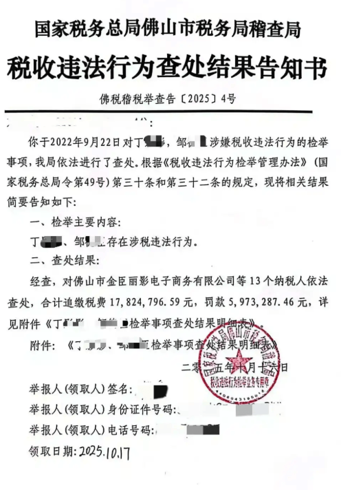 据华商报大风新闻报道,实名举报人樊女士称,她已拿到税务部门出具的查处结果告知书,900多万粉丝抖音网红小影夫妇,因偷逃税被广东佛山市税务局稽查局查处,合计追缴税费17824796.59元,罚款5973287.46元,合计金额高达2379万元。