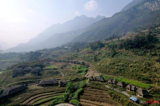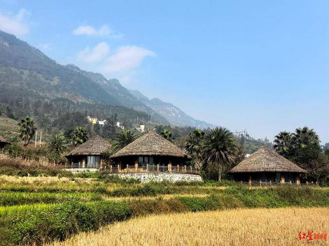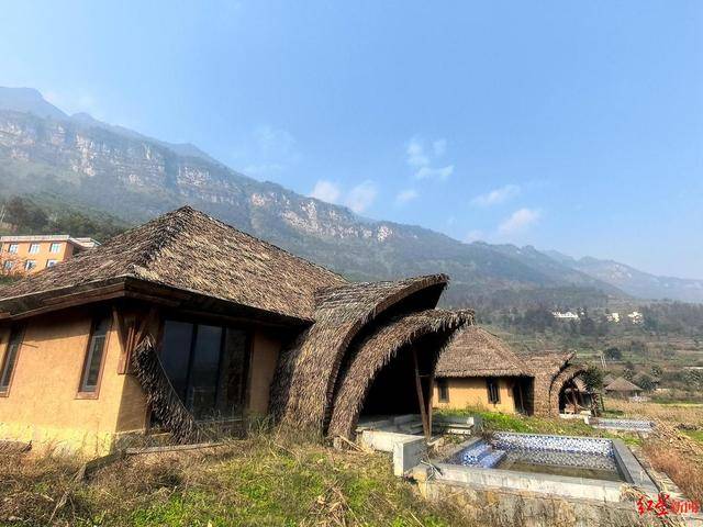 “稻田酒店”位于村里的河谷旁。12月1日,红星新闻记者来到现场发现,数十栋建筑错落分布,周围有梯田、民房等。其中大部分建筑已成型,完成了内部基装,另有部分建筑未完工。这些建筑设计别致,屋顶铺有茅草,不少房屋前还建有水池。但由于长时间无人打理,房屋周围杂草丛生,外墙及内部部分设施或装饰有破损。