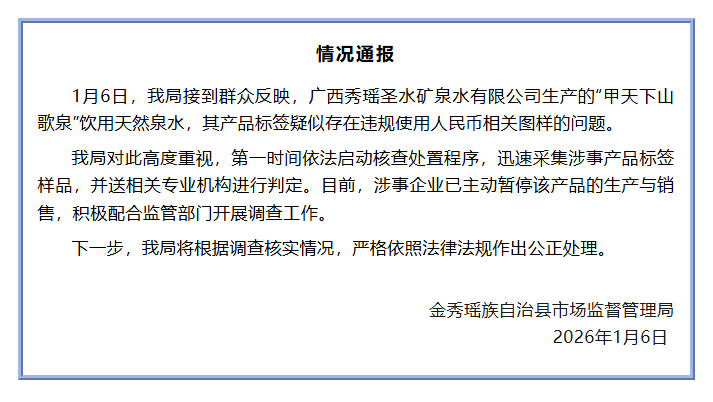 央广网北京1月7日消息 广西金秀瑶族自治县市场监督管理局1月6日通报:我局接到群众反映,广西秀瑶圣水矿泉水有限公司生产的“甲天下山歌泉”饮用天然泉水,其产品标签疑似存在违规使用人民币相关图样的问题。