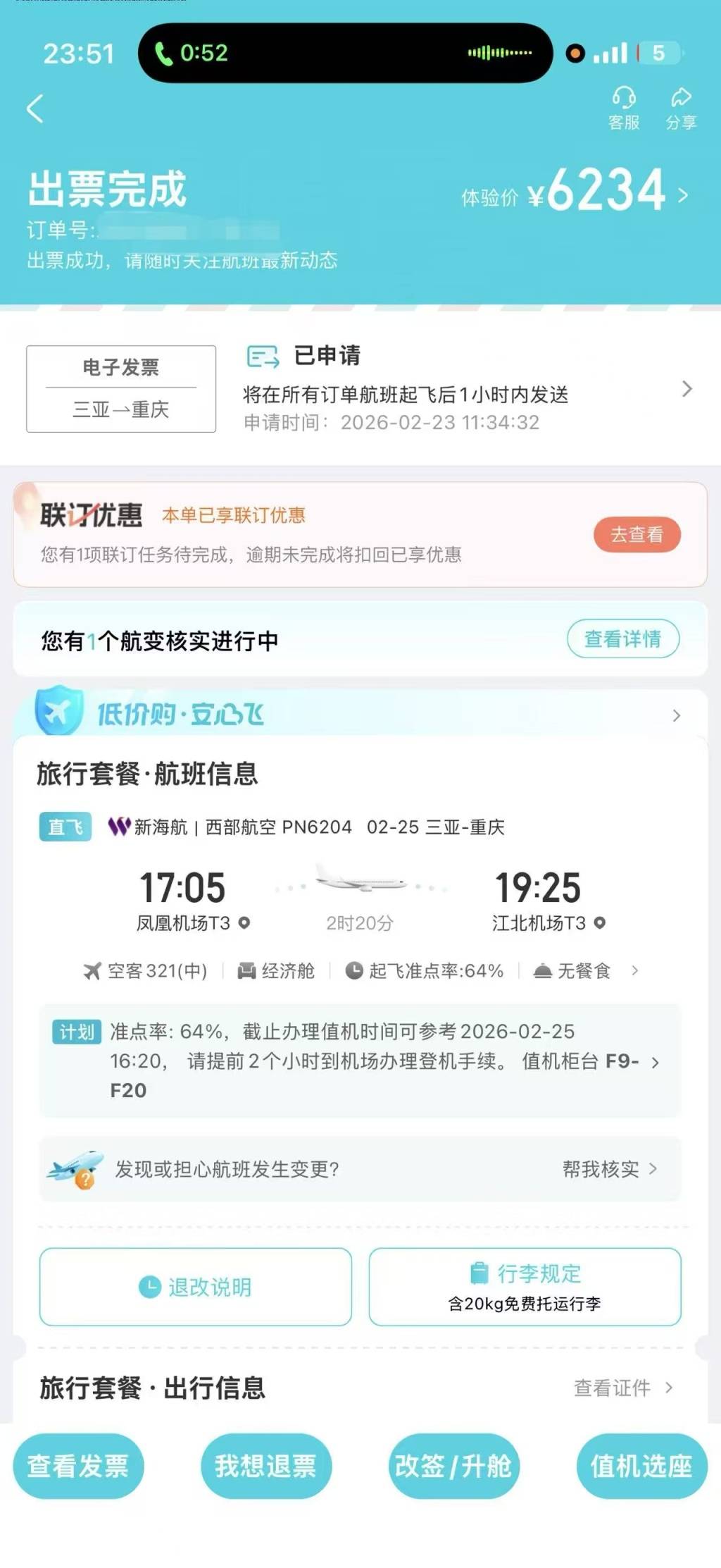 蹇女士第二次订购PN6204航班的订单截图
