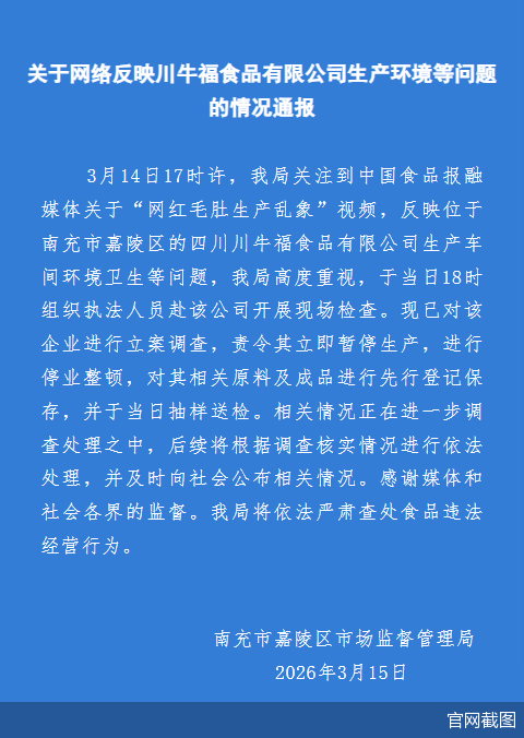 3月15日,网红鹿哈带货牛肚加工环境问题登上热搜。对此,四川南充市嘉陵区市场监督管理局针对关于“网红毛肚生产乱象”视频发布情况通报:已对川牛福食品有限公司进行立案调查,责令其立即暂停生产,进行停业整顿,对其相关原料及成品进行先行登记保存,并于当日抽样送检。
