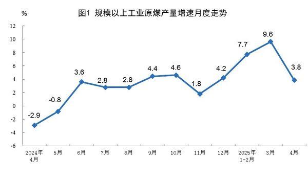 原煤生产稳定增长。4月份,规上工业原煤产量3.9亿吨,同比增长3.8%,增速比3月份回落5.8个百分点;日均产量1298万吨。