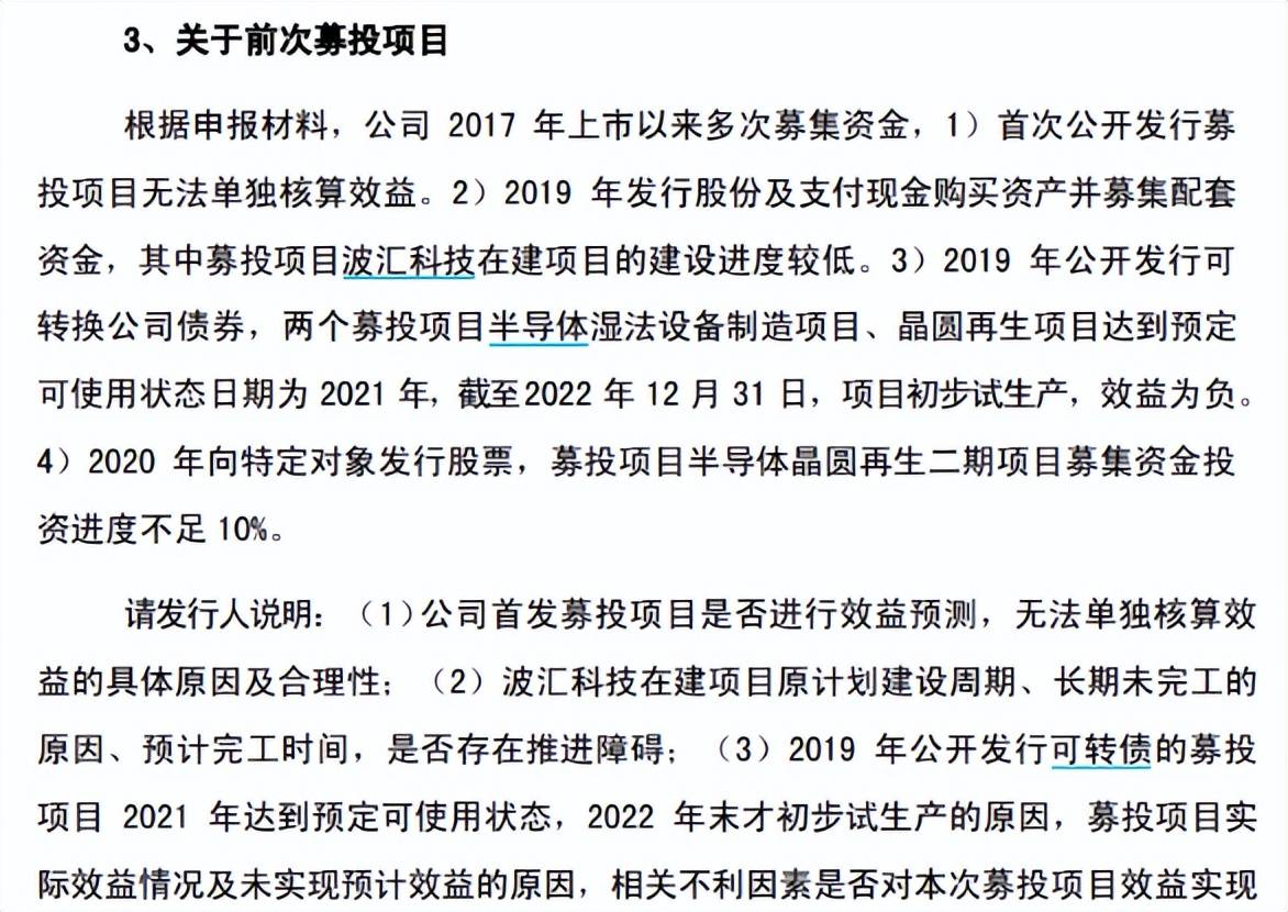 值得注意,在这份问询函中,交易所也注意到公司自IPO以来频繁的募集资金,但募投效果却不及预期。例如2019年的定增计划中,募投项目波汇科技在建项目的建设进度较低;2019年公开发行可转换公司债券,两个募投项目达到预定可使用状态日期为2021年,截至2022年末,项目初步试生产,效益为负;2020年的定增计划,募投项目半导体晶圆再生二期项目募集资金投资进度不足10%。