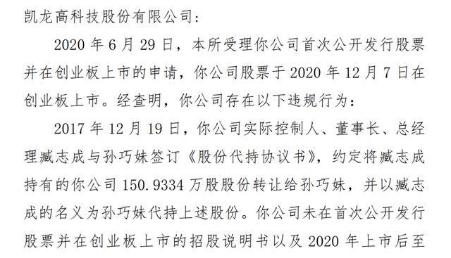 IPO股份违规代持隐瞒长达七年,凯龙高科(300912)被深交所采取书面警示措施。