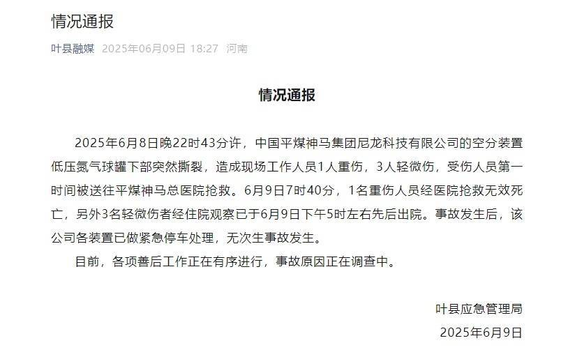 2025年6月8日晚22时43分许,中国平煤神马集团尼龙科技有限公司的空分装置低压氮气球罐下部突然撕裂,造成现场工作人员1人重伤,3人轻微伤,受伤人员第一时间被送往平煤神马总医院抢救。6月9日7时40分,1名重伤人员经医院抢救无效死亡,另外3名轻微伤者经住院观察已于6月9日下午5时左右先后出院。事故发生后,该公司各装置已做紧急停车处理,无次生事故发生。