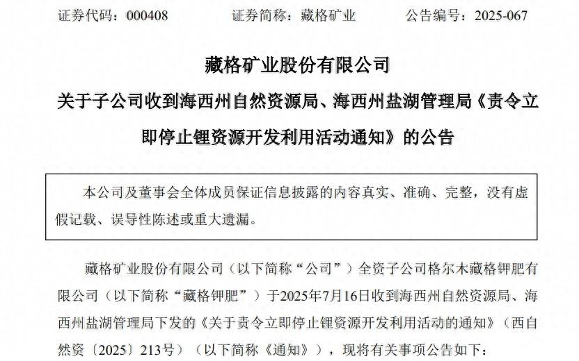 7月17日,藏格矿业(000408)发布公告,全资子公司格尔木藏格钾肥有限公司于2025年7月16日收到海西州自然资源局、海西州盐湖管理局下发的《责令立即停止锂资源开发利用活动通知》,通知要求公司立即停止违规开采行为,并积极整改。