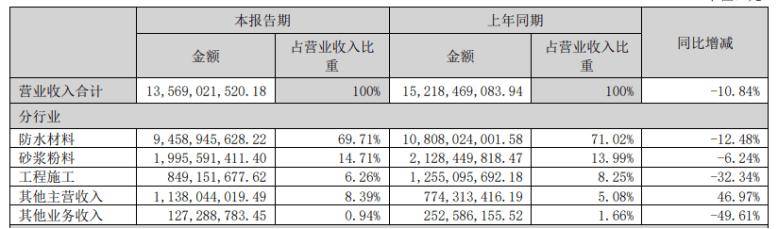 东方雨虹业绩滑坡源于盈利能力承压与市场竞争的双重夹击。半年报显示,核心业务防水材料的收入同比下降12.48%至94.59亿元,工程施工收入同比下降32.34%至8.49亿元。作为防水材料主要的下游市场,房地产行业的结构性调整直接冲击了公司的核心业务。
