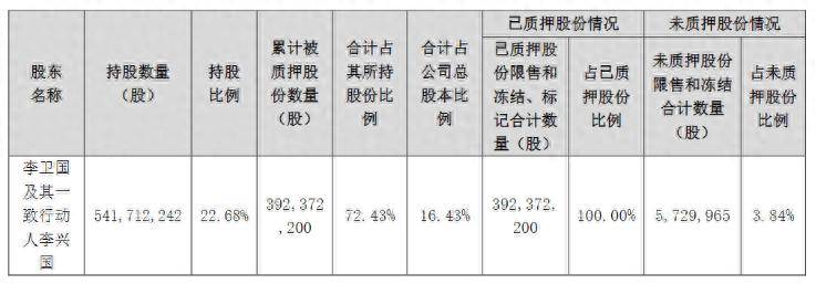 此外,李卫国还进行了高比例股权质押。根据7月3日披露的公告,李卫国对其所持的1850万股股份办理了解除质押手续。目前,李卫国及其一致行动人李兴国合计持有5.42亿股股份,占总股本的22.68%。上述股份质押解除后,李卫国及李兴国累计被质押股份数仍高达3.92亿股,占其所持股份的72.43%,占公司总股本的16.43%。