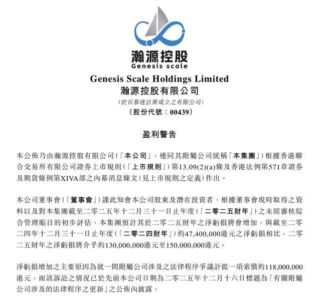 近日瀚源控股(00439.HK)公告,根据董事会现时取得之资料以及对集团截至2025年12月31日止年度(2025财年)之未经审核综合管理账目的初步评估,集团预计其于2025财年之净亏损将会增加,与截至2024年12月31日止年度(2024财年)约4740万港元之净亏损相比,2025财年之净亏损将介乎约1.3亿港元至1.5亿港元。